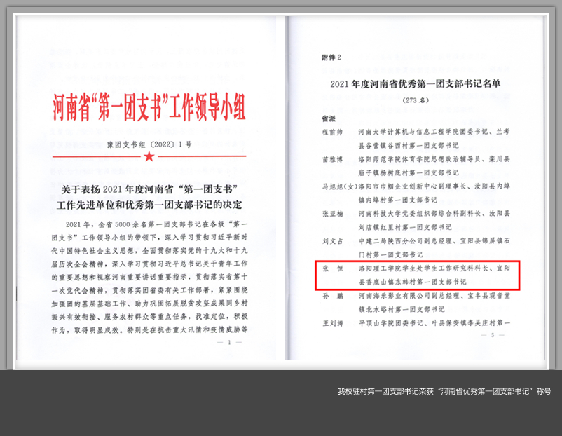 近日,河南省“第一团支书”工作领导小组下发《关于表扬2021年度河南省“第一团支书”工作先进单位和优秀第一团支部书记的决定》(豫团支书组[2022]1号),对全省5000余名第一团支部书记中涌现出的先进典型予以通报表扬。我校省派驻宜阳县香鹿山镇东韩村第一团支部书记张恒同志被授予“河南省优秀第一团支部书记”荣誉称号。