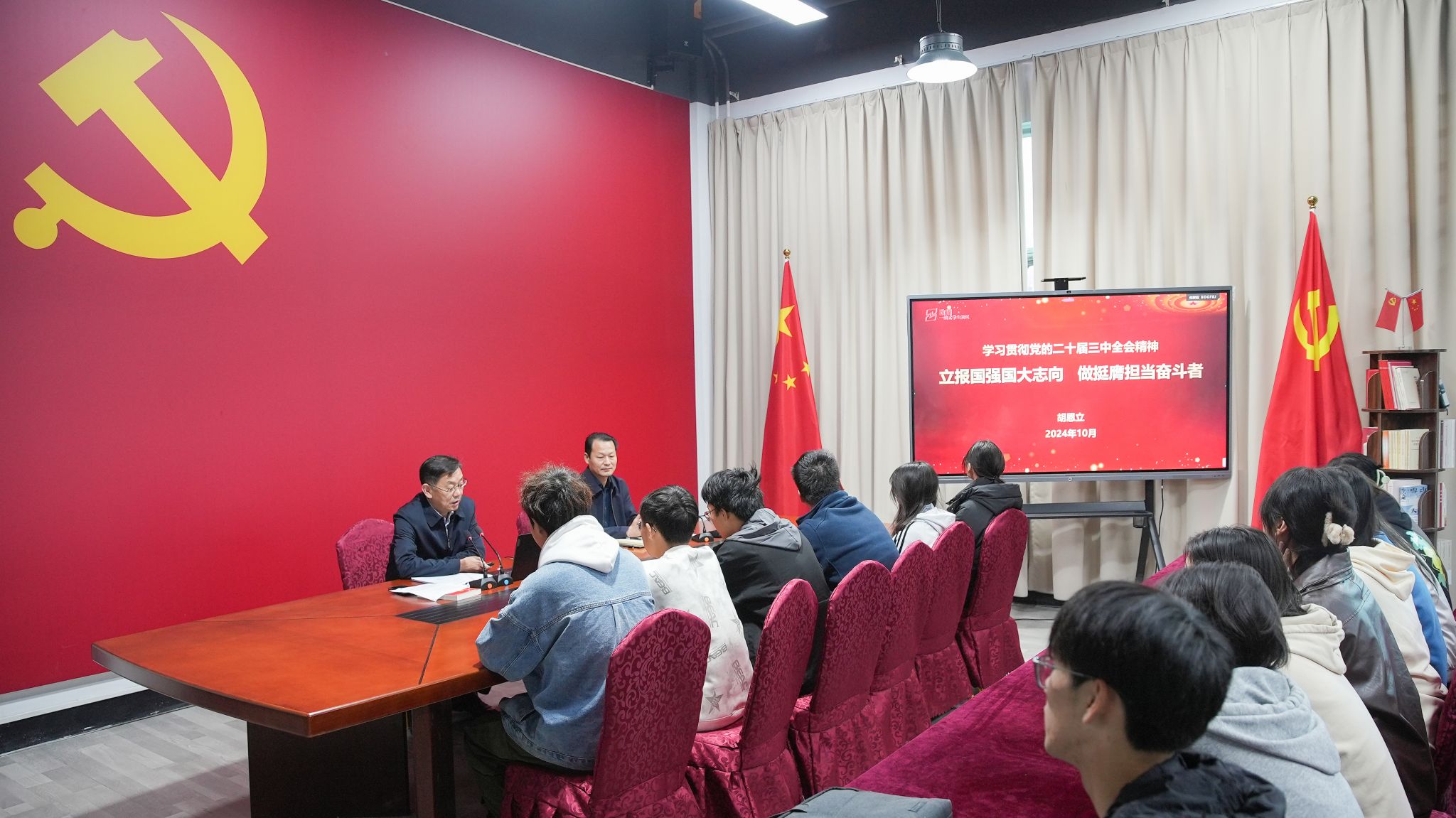 为学习贯彻党的二十届三中全会精神,深入领会习近平总书记关于全面深化改革的一系列新思想、新观点、新论断,10月30日下午,党委副书记胡恩立深入致臻社区以《立报国强国大志向 做挺膺担当奋斗者》为题为师生们宣讲党的二十届三中全会精神。致臻社区党工委、团工委、全体学工人员、社区自治委员会学生骨干及胡恩立联系班级B240906班全体学生到场聆听。宣讲会由致臻社区党工委书记主持。